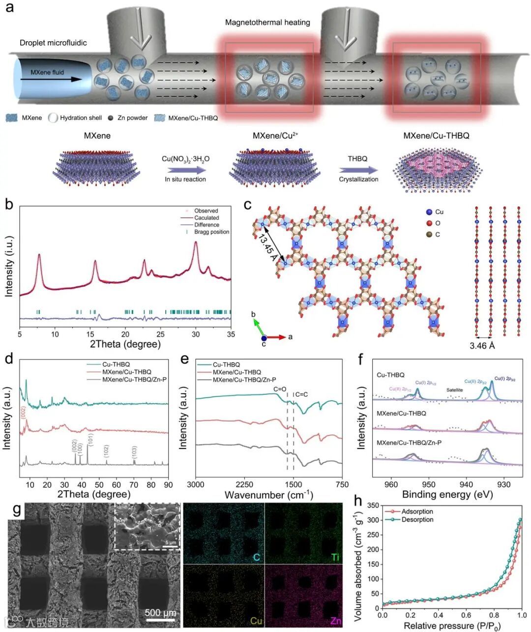 图2. a) MXene/Cu-THBQ/Zn-P可打印混合油墨的微流控合成和异质结构MXene/Cu-THBQ的合成机理。b) Cu-THBQ的PXRD图谱。c) Cu-THBQ的晶体结构。Cu-THBQ、MXene/Cu-THBQ、MXene/Cu-THBQ/Zn-P的d) XRD。e) FTIR。f) XPS图。g) M3DP-MXene/Cu-THBQ/Zn-P气凝胶负极的SEM和EDS图。h) M3DP-MXene/Cu-THBQ/Zn-P负极的N2吸附等温线。