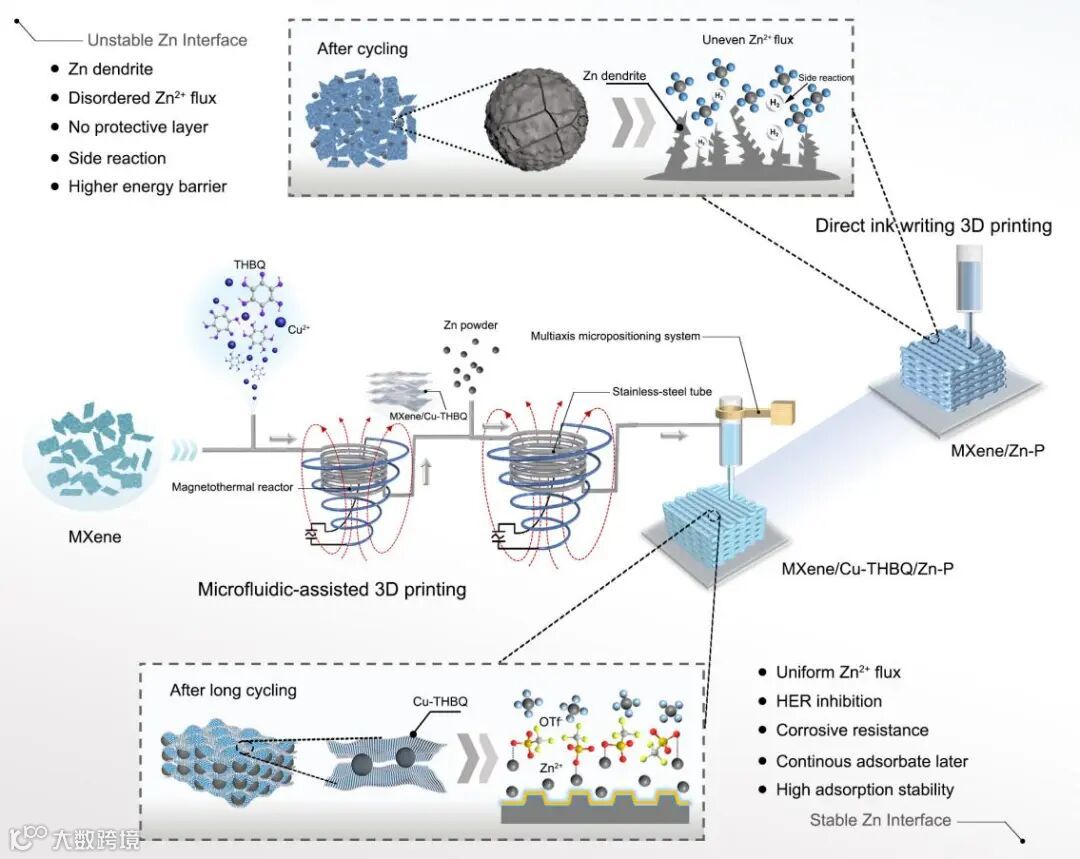 基于这些问题,我们报道了一种基于超薄2D导电金属有机框架(MOF)/MXene纳米片制备三维多孔Zn-P气凝胶的新型微流控辅助3D打印(M3DP)策略,用于无枝晶Zn负极的制备。目前,传统的墨水直写技术只能实现墨水的挤压,而不能直接调控墨水内部的物质结构和功能。相比之下,磁热微流体辅助3D打印是一种基于微流体的创新打印技术,可以在微流体通道中修饰原材料,并在墨水流动过程中通过外部条件改变形貌。具体来说,M3DP由三通道微流体装置和磁热反应器(包括感应线圈和螺旋不锈钢管)组成。将Ti3C2Tx MXene纳米片、Cu(NO3)2·3H2O和四羟基-1,4-苯醌(THBQ)溶液注入微通道并混合,以在超声振动和随后的快速升温下形成MXene与Cu-THBQ (MXene/Cu-THBQ)异质结构纳米片的良好分散体。随后,将Zn-P溶液加入通道中,与MXene/Cu-THQ形成混合物,然后混合物溶液进一步流入不锈钢管中,MXene/Cu-THBQ纳米片在磁热反应器中瞬时加热后,由于热效应,伴随着油墨的浓缩,在Zn-P表面上聚集。在此过程中,获得了具有均匀包裹在Zn-P周围的功能性MXene/Cu-THBQ纳米片的浓缩可印刷油墨,并且使用联动的3D打印挤出装置打印得到了Zn-P基MXene/Cu-THBQ气凝胶Zn负极(M3DP-MXene/Cu-THBQ/Zn-P)。
