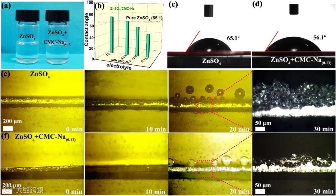图2. (a) 两种电解质的照片。(b) 不同添加剂含量的电解质与锌片的接触角。(c) ZnSO4电解质和 (d) ZnSO4+CMC-Na(0.13)电解质与裸锌的接触角;镀锌过程中锌电极的原位光学显微镜图像:(e) ZnSO4,(f) ZnSO4+CMC-Na(0.13)电解质。