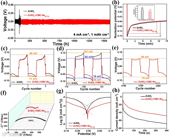 室温下,ZnSO4电解质和ZnSO4+CMC-Na电解质显示为透明液体(图2a)。图2b-d显示了通过接触角测量了锌片与不同电解质的亲水性。纯ZnSO4与裸Zn的接触角65.1°,ZnSO4+CMC-Na(0.13)电解质与裸Zn的接触角为56.1°。随着添加剂含量的减少,接触角逐渐减小,润湿性增加。高润湿性可有效促进Zn2+的转移,并有利于电解质的渗透。同时,研究了Zn阳极在ZnSO4和ZnSO4+CMC-Na(0.13)电解液中电镀中的表面形貌演变。在ZnSO4电解液中锌阳极表面呈现出无序堆叠不均匀的树枝状枝晶生长(图2e),而在ZnSO4+CMC-Na(0.13)电解液中锌阳极只有细小的微粒生成(图2f)。