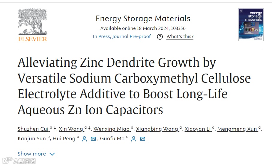 Shuzhen Cui‡, Xin Wang‡, Wenxing Miao, Xiangbing Wang, Xiaoyan Li, Mengmeng Xun, Kanjun Sun, Hui Peng*, Guofu Ma*. Alleviating Zinc Dendrite Growth by Versatile Sodium Carboxymethyl Cellulose Electrolyte Additive to Boost Long-Life Aqueous Zn Ion Capacitors. Energy Storage Materials, 2024, 103356.