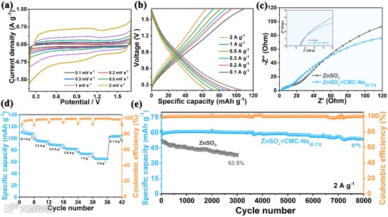 图4. ZnSO4+CMC-Na(0.13)电解液组装的Zn//AC ZICs的: (a) CV曲线。(b) 比容量曲线。(c)奈奎斯特图。(d) 倍率性能和 (e) 长循环性能。