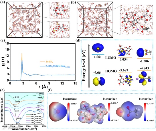 图1. (a, b) ZnSO4和ZnSO4+CMC-Na(0.13)电解质的分子动力学模型,(c) Zn-O(H2O)的径向分布函数;(d) H2O和CMC-Na分子的LUMO-HOMO能带隙和示意图,(e) ZnSO4和ZnSO4+CMC-Na(0.13)电解质的傅立叶变换红外光谱,(f) H2O和CMC-Na分子的静电势图。