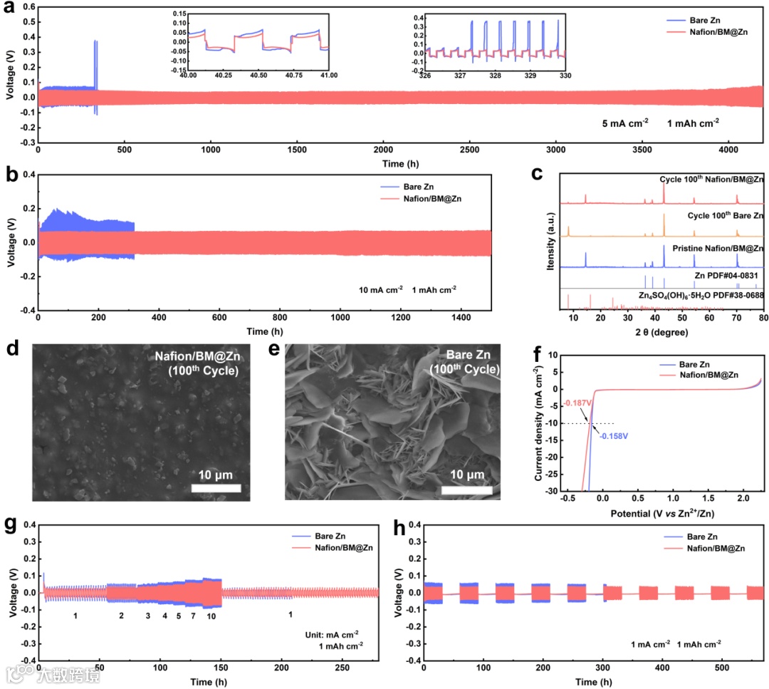 要点四:使用纯水和海水为电解质,Nafion/BM@Zn负极均表现出优异的稳定性。