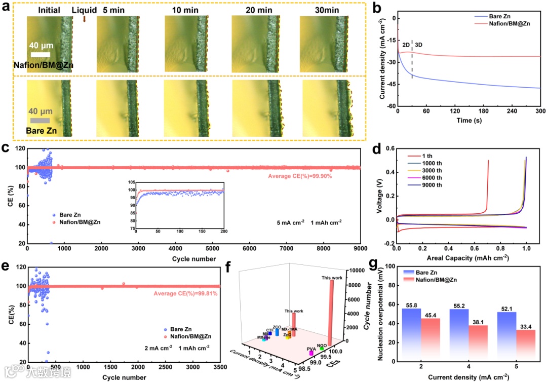 图3 (a) 裸锌和Nafion/BM@Zn负极界面上Zn2+沉积过程的原位光学显微图像; (b) 对称电池的CA曲线; (c) Zn//Cu半电池在5 mA cm-2-1 mAh cm-2下的平均库仑效率;(d) 电压曲线;(e) 在2 mA cm-2-1 mAh cm-2下的平均库仑效率; (f) Zn//Cu电池沉积可逆性与以往文献的比较; (g) Zn//Cu半电池的成核过电位。