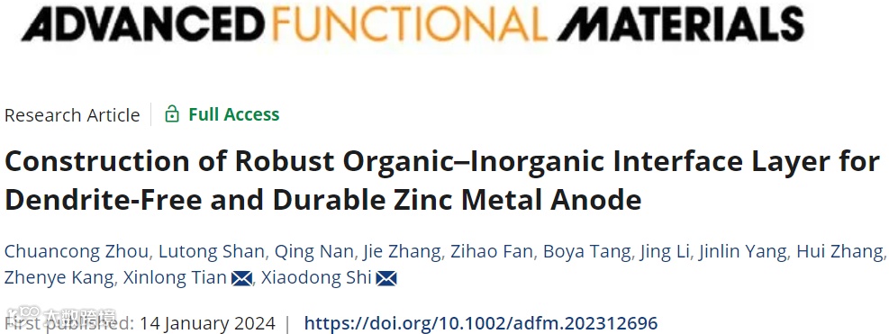 Chuancong Zhou#, Lutong Shan#, Qing Nan, Jie Zhang, Zihao Fan, Boya Tang, Jing Li, Jinlin Yang, Hui Zhang, Zhenye Kang, Xinlong Tian*, Xiaodong Shi*. Construction of robust organic-inorganic interface layer for dendrite-free and durable zinc metal anode. Advanced Functional Materials, 2024, DOI: 10.1002/adfm.202312696.