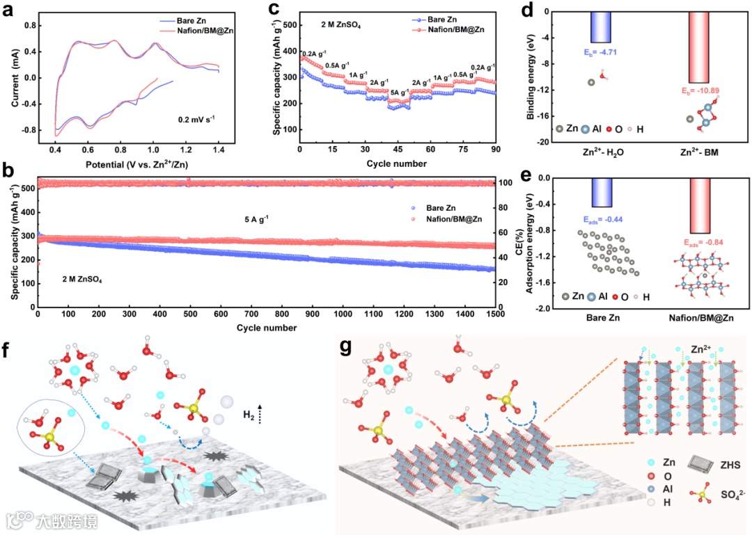 图4 Nafion/BM@Zn//NH4V4O10全电池在2M ZnSO4电解质中的电化学性能。(a) CV曲线; (b) 长循环性能; (c) 倍率能力; (d) Zn2+离子与H2O和软水铝石分子的结合能; (e) 锌原子与裸锌和软水铝石的吸附能; (f) 裸锌和(g) Nafion/BM@Zn负极的锌沉积行为示意图。