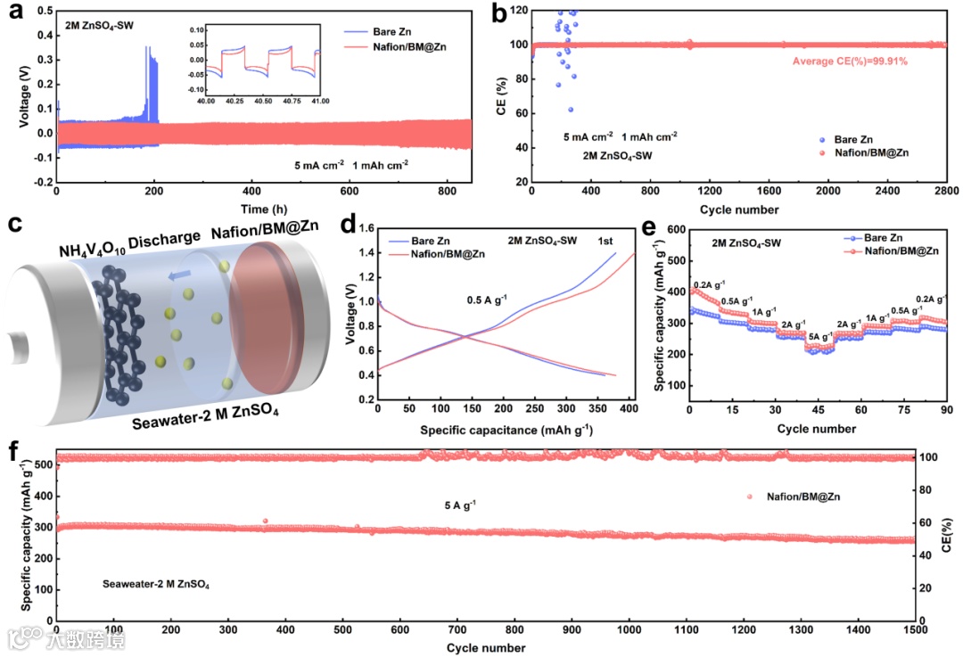 图5 Nafion/BM@Zn负极在2M ZnSO4海水电解质中的电池性能。(a) 对称电池长循环性能; (b) Nafion/BM@Zn//Cu电池平均库仑效率; (c) Nafion/BM@Zn//NH4V4O10海水全电池示意图; (d) Nafion/BM@Zn//NH4V4O10全电池的首圈充放电曲线; (e) 倍率性能; (f) 长循环性能。
