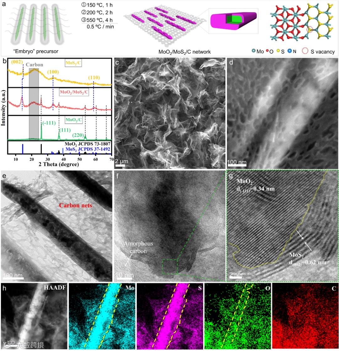 图2. a) MoO2/MoS2/C网络纳米结构的制备示意图。b) 所制备的 MoO2/C、MoO2/MoS2/C和MoS2/C的XRD图谱的比较。c、d)FESEM,e,f)TEM,g)HRTEM图像,h)分别为MoO2/MoS2/C的HAADF图像和相应的EDS映射图像。