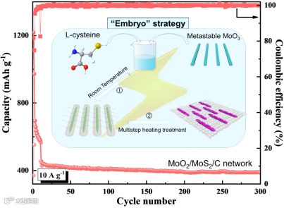 钠离子电池(SIBs)由于丰富的钠资源以及与锂离子电池相似的储能机制而备受关注。与锂离子相比,较大半径的钠离子阻碍了其在充放电过程中嵌入/脱出电极的动力学反应过程,导致SIBs的倍率容量和稳定性一般较差。作为我国钼资源优势的典型代表,层状MoS2和隧道骨架单斜MoO2因其具有大的层间距和高的理论容量,被认为是理想的储钠阳极材料。然而,MoO2和MoS2的导电性差和结构不稳定易于引发反应动力学缓慢和体积坍塌,限制了其在SIBs领域应用。针对以上两个关键难题,本工作借助介稳态单斜MoO3和三功能L-半胱氨酸,提出了一种基于“胚胎”策略的材料合成方法,制备出具有纳米棒镶嵌的富硫空位MoO2/MoS2/C网络结构材料,提升了钼基电极材料的储钠倍率性能和循环稳定性。