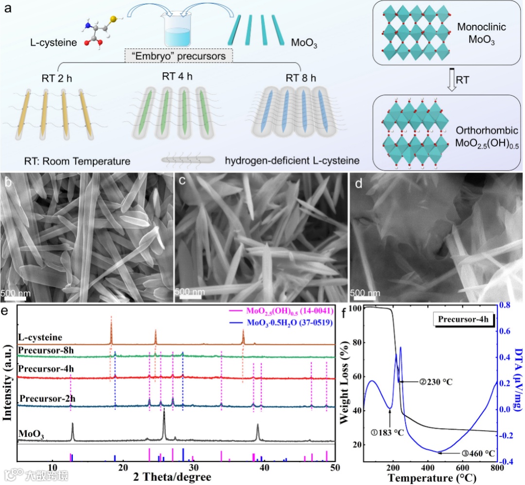 “胚胎”制备示意图如图1a所示:将L-半胱氨酸和介稳态单斜MoO3纳米棒在室温水溶液中混合搅拌,通过改变搅拌时间,可将不同含量的MoO3类似物(MoO2.5(OH)0.5和 MoO3·0.5H2O)和含氢缺陷L-半胱氨酸封装在“胚胎”前驱体中。从图1b-d和图S2所示的FESEM图像来看,调节搅拌时间,纳米棒可不同程度地被L-半胱氨酸腐蚀和包覆,形成不同形态的“胚胎”前体。从XRD图谱中可以看出,伴随着属于正交MoO2.5(OH)0.5(JCPDS#14-10041)和MoO3·0.5H2O(JCPDS#37-0519)的新峰的产生,属于介稳MoO3的(12.9°、25.8°和39.0°)峰逐渐消失(图1e),这表明 L-半胱氨酸的H可能插入到了MoO3。18.2°、24.5°和36.9°处三个峰与标准L-半胱氨酸峰位相比显示出轻微偏移,且这些峰在前体-4中出现,并在前体-8中变强,说明前体中可能含有缺氢的L-半胱氨酸。