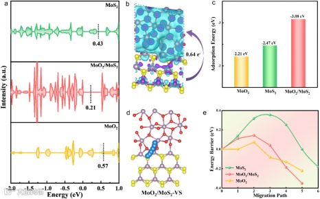 图5. a) MoO2、MoO2/MoS2和MoS2中Mo3d轨道的PDOS。b)MoO2/MoS2。c) Na+在MoO2、MoO2/MoS2和MoS2中的吸附能的比较。d) Na+在MoO2/MoS2中的扩散路径。e) Na+在MoO2、MoO2/MoS2和MoS2中扩散能垒的比较。
