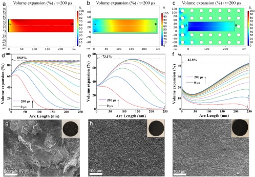 图4. a,d)裸杆状模型,b,e)薄层碳涂层模型和c,f)纳米棒嵌入多孔网络模型的二维模拟结果和相应的体积变化率。分别为(g)MoO2/C电极、h)MoS2/C电极和i)MoO2/MoS2/C电极的数字照片和FESEM图像