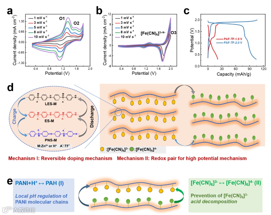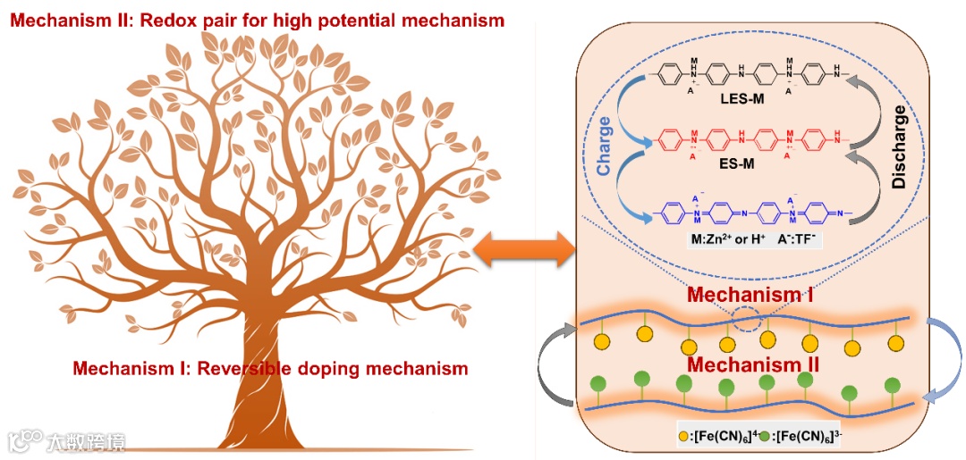 机制Ⅱ的实现得益于机制I的聚苯胺通过H+掺杂过程在分子链表面形成了局部pH调节,从而提供了一个稳定的反应场所。特别是,这种氧化还原对的引入带来了超高的容量贡献(容量占比高达73.2%)。