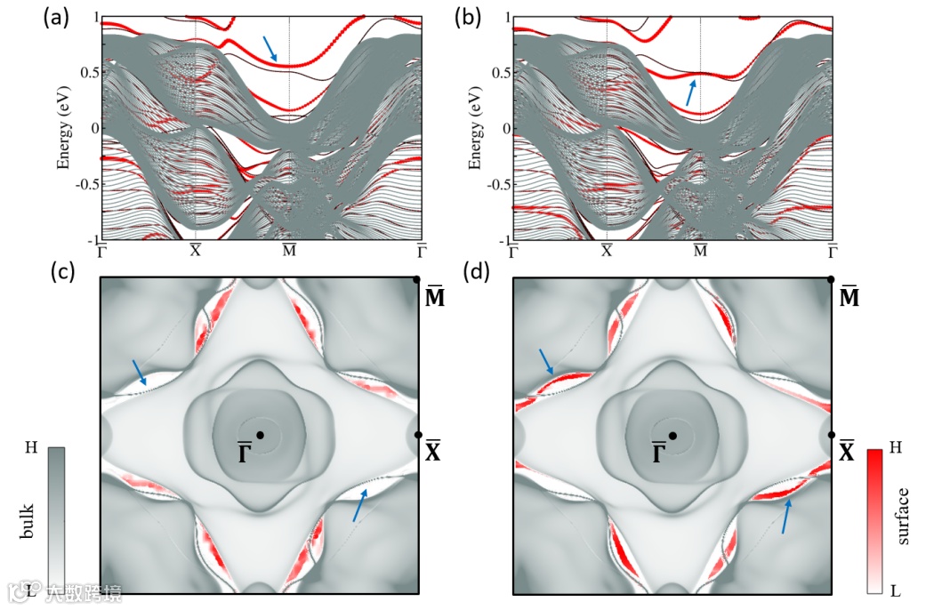 通过计算十个原胞厚度的表面模型,文中分析了吸附前后的材料表面态和费米面的变化。表面电子结构的分析结果显示表面能带主要由Tc的d轨道贡献,吸附后H原子的s轨道沉到了更低的能级。虽然大部分的表面态都被体态所覆盖,但吸附前后表面态和费米面的变化仍十分明显,表明在催化过程中主要由表面Tc原子的d轨道参与反应。