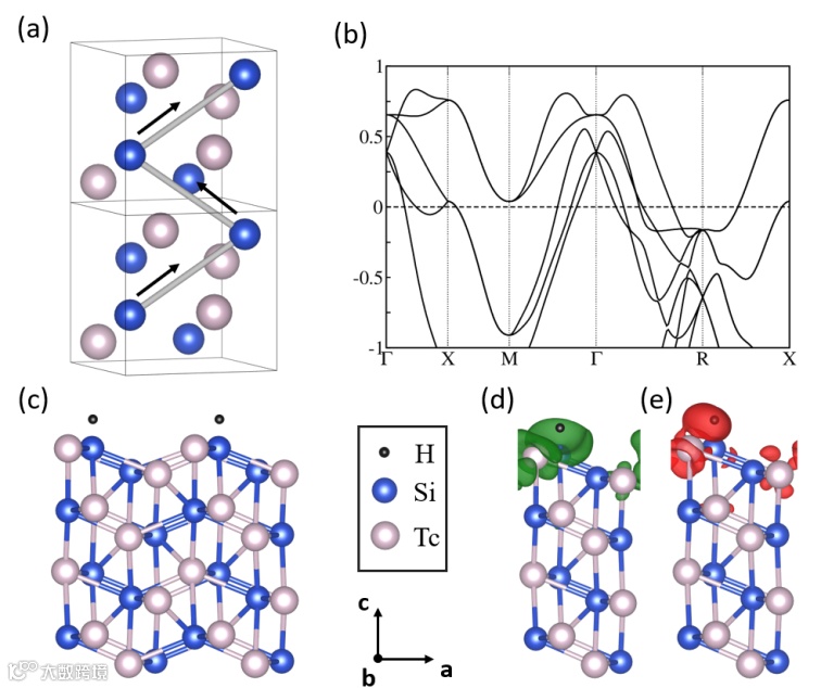 通过计算电子能带结构获得该材料的拓扑能量窗口大小为0.550 eV,与PtAl、PtGa相当。计算结果显示最稳定的吸附位点为表面的hollow位,其吸附能为 -0.302 eV,对于氢吸附来说这是一个既不强也不弱的值,最终的氢吸附吉布斯自由能为 -0.062 eV, 甚至比Pt( ~ -0.09 eV)更靠近零点。电荷密度差分图的结果显示在反应过程中,电荷主要在表面的Tc原子附近减少,在H原子附近增加,且其形状分别表现出d轨道和s轨道的特征,说明催化反应过程中表面Tc原子的化学反应活性较高。