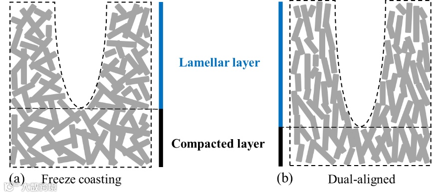 图2. 由(a)冷冻铸造法和(b)双定向法制备的电极的结构示意图。
