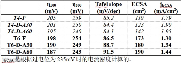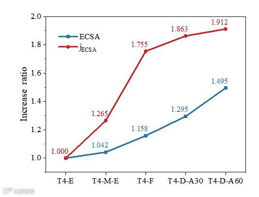 图4.各电极相对于T4-E的ECSA和jECSA的增长率。