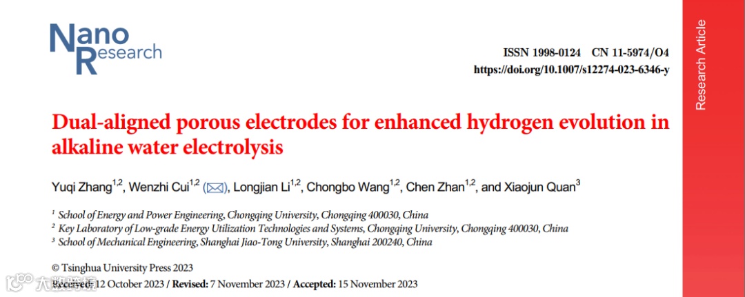 近日,来自重庆大学的崔文智教授团队在Nano Research上发表题为“Dual-aligned porous electrodes for enhanced hydrogen evolution in alkaline water electrolysis”的文章。该文章采用磁场定向与冷冻铸造法相结合的双定向法制备了一种双定向多孔电极,该电极结构有效提高了电极的析氢性能。