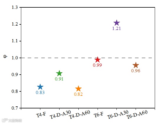 为分析双定向方法制备电极的析氢性能增强的原因,我们定义了气泡去除能力评估参数φ。若φ>1,说明气泡对反应的影响随着电流密度的增大而增大,即电极的气泡去除能力较差。反之,若φ<1,则电极的气泡去除能力较强。图5展示了每个定向多孔电极的φ值。值得注意的是,600 μm厚的电极φ值高于使用相同方法制备的400 μm厚的电极,表明增加电极厚度会增加气泡在电极内的传输阻力。对于相同厚度的电极,随着磁场定向时间增加,其气泡去除能力先减小后增加。