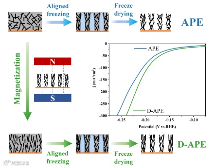高效电极通常采用多孔结构来提高比表面积,如商业泡沫镍电极。然而,实现比表面积和气泡传输阻力之间的平衡是具有挑战性的。孔径较小的泡沫镍会阻碍气泡的传递,而孔径较大的泡沫镍则会减少电极的活性面积。采用冷冻铸造法制备的定向多孔电极具有双孔径,大孔从电极内部直通电极表面,为气泡传输提供了快速通道;小孔位于大孔的壁面,为反应提供了充足的活性位点。为了进一步降低气泡传输阻力,我们将磁场定向与冷冻铸造法相结合,采用二维片状镍粉制备了双定向多孔电极(D-APE),比较了不同制备方法对电极析氢性能的影响,并探讨了磁场定向提高电极析氢性能的机理。