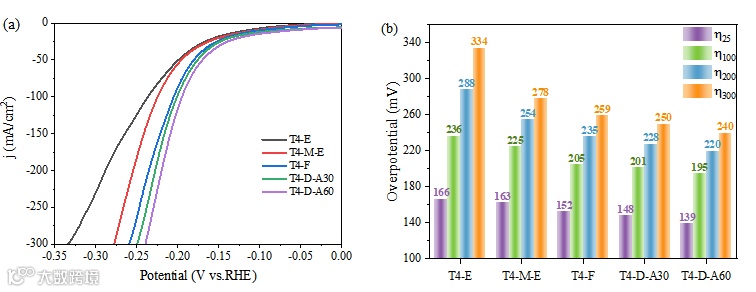 图4为各电极相对于T4-E的ECSA和jECSA的增长率。与T4-E相比,其他电极的ECSA增加幅度从4.2%到49.5%,而jECSA增加幅度则从26.5%到91.2%。jECSA的显著增加表明电极的活性位点上的析氢强度明显提高。电极结构的变化使其jECSA明显变化,如电极由致密结构(T4-M-E)变为定向结构(T4-F)时,其jECSA增加显著。而电极结构相似,即便其ECSA大幅度增加,如T4-D-A30至T4-D-A60,其jECSA变化也不明显。这表明电极孔隙结构的改变是影响其性能的主要因素。