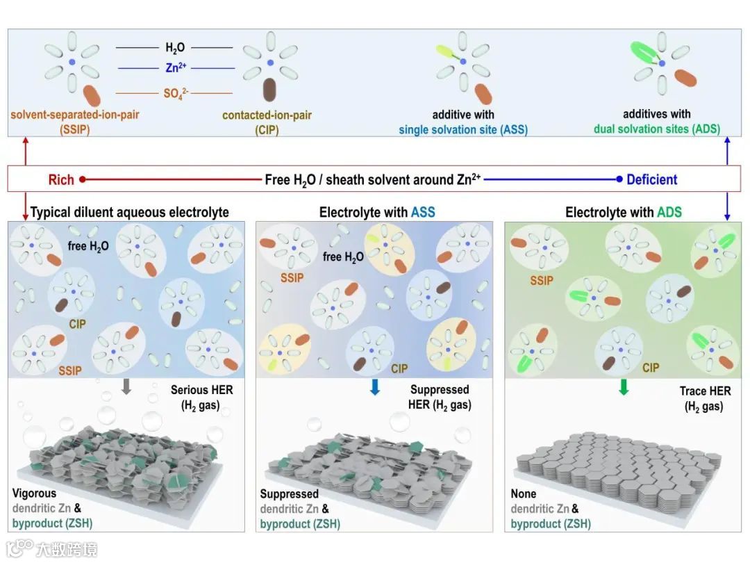 图1.水系电解质中活性水分子的减少对抑制副反应、析氢反应(HER)和锌枝晶生长的重要性。从左到右,分别为在传统水系电解液、添加了具有单溶剂化位点的添加剂(ASS)的电解液以及添加了具有双溶剂化位点的添加剂(ADS)的电解液中工作的锌金属情况