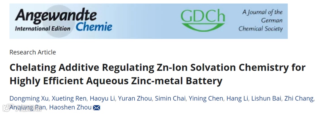 近日,来自中南大学常智教授、潘安强教授与南京大学周豪慎教授合作,在国际知名期刊Angew上发表题为“Chelating Additive Regulating Zn-Ion Solvation Chemistry for Highly Efficient Aqueous Zinc-metal Battery”的观点文章。该观点文章发现具有双溶剂化位点的N-乙酰基-ε-己内酰胺(N-ac)作为锌离子电池电解液添加剂时可以极大抑制AZMB中常见的与活性水有关的严重副反应。基于添加剂改性的电解液的锌金属电池实现了优异的库仑效率与循环寿命。