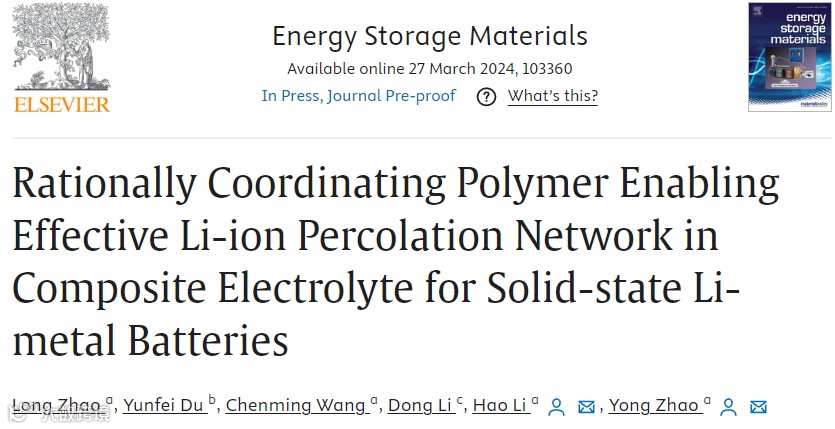 Long Zhao, Yunfei Du, Chenming Wang, Dong Li, Hao Li,* and Yong Zhao*, Rationally Coordinating Polymer Enabling Effective Li-ion Percolation Network in Composite Electrolyte for Solid-state Li-metal Batteries, Energy Storage Materials 2024.