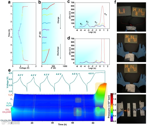 图5(a-d)NMC/SCPN/Li电池的原位EIS及相应的弛豫时间分布图。(e)NMC/SCPN/Li电池的原位差分电化学质谱图。(f)NMC/SCPN/Li软包电池的安全性测试。