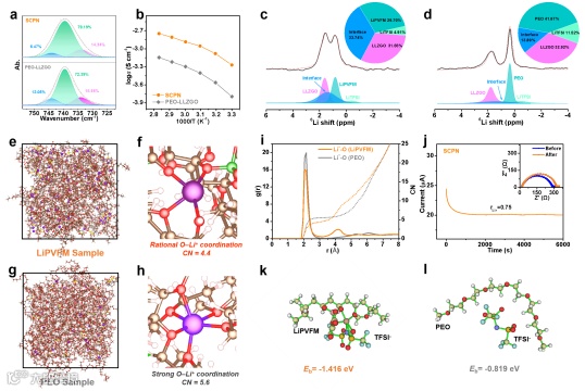 图2(a)SCPN和PEO-LLZGO的FTIR光谱。(b)SCPN和PEO-LLZGO样品离子电导率随温度的变化曲线。(c)SCPN和(d)PEO-LLZGO样品的6Li 固态核磁。分子动力学模拟得到(e, f)LiPVFM和(g, h)PEO与Li+的配位图。(i)从MD中得到的径向分布函数。(j)SCPN锂离子迁移数的测定。(k)LiPVFM与TFSI−和(l)PEO链与TFSI−的结合能。