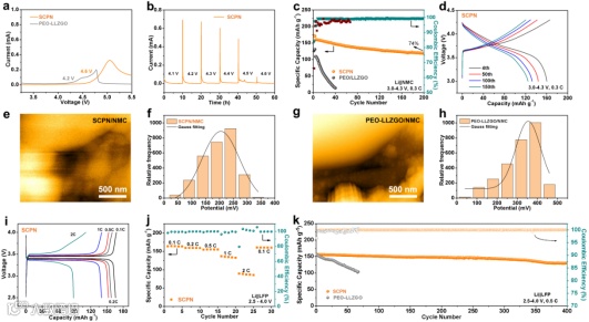 图4(a)SCPN和PEO-LLZGO的LSV曲线。(b)NMC/SCPN/Li电池的电化学浮动测试曲线。(c)NMC/SCPN/Li电池的循环性能和(d)容量-电压电曲线。(e,f)SCPN/NMC和(g,h)PEO-LLZGO/NMC界面的电势分布图。LFP/SCPN/Li电池的(i, j)倍率性能和循环性能表征。