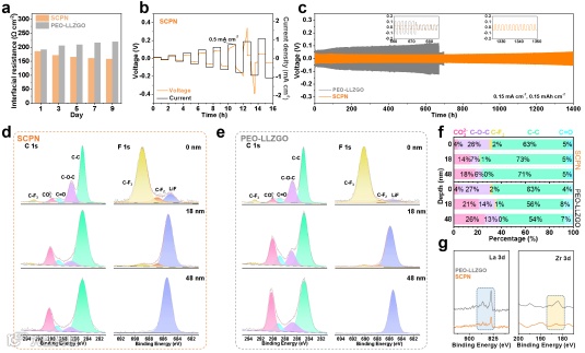 图3(a)不同静置时间下SCPN基锂对称电池的界面阻抗变化。(b)SCPN基锂对称电池的极限电流密度测试。(c)SCPN基锂对称电池的剥落沉积测试。循环后的锂片的XPS表征:(d)SCPN和(e)PEO-LLZGO;(f)从C 1s中得到的各组分的含量图;(g)锂片表面La 3d和Zr 3d的含量对比。