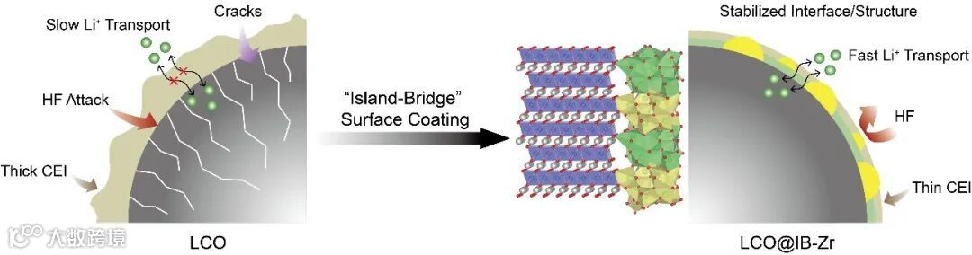 图8. LCO“岛-桥”结构锆基包覆层提升LCO性能的机制示意图。