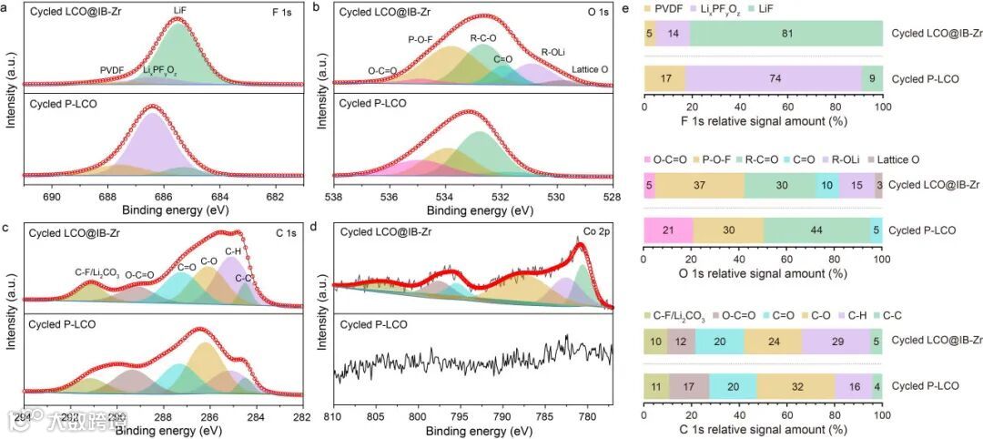 对循环后的电极材料进行表征分析,由图5可以看到,未包覆LCO出现严重裂纹,且表面生成厚且不均匀的CEI。而“岛-桥”包覆LCO能够保持完整的结构,形成的CEI厚度很薄。此外,通过XPS分析(图6),“岛-桥”结构包覆的LCO形成的CEI以无机物为主,而未包覆LCO形成以有机物为主的CEI。以上结果表明,“岛-桥”结构锆基包覆层能够有效提高LCO的表界面稳定性和结构稳定性,抑制正极-电解液间副反应,从而实现电化学性能的提升。