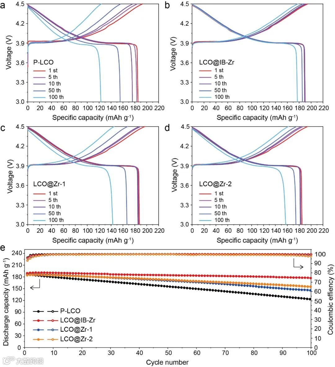 图3. P-LCO、LCO@IB-Zr、LCO@Zr-1和LCO@Zr-2在3.0-4.5 V,0.1 C下的电化学性能:(a-d) 充放电曲线,(e) 循环性能。