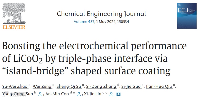 近日,广西师范大学林茜颉、盐城工学院孙勇刚、中国科学院化学研究所曹安民,在国际知名期刊Chemical Engineering Journal上发表题为“Boosting the electrochemical performance of LiCoO2by triple-phase interface via “island-bridge” shaped surface coating”的研究论文。通过对包覆过程进行调控,在LCO表面构筑了具有独特“岛-桥”结构的锆基包覆层,即LCO@IB-Zr。该工作详细研究了“岛-桥”结构包覆层的形成机理。通过系统的性能测试,表明“岛-桥”结构锆基包覆层能够有效提升LCO的表界面稳定性和结构稳定性,从而实现4.5 V(vs Li+/Li)电压下LCO循环稳定性、倍率性能的显著提升。此外,该工作借助理论计算研究了“岛-桥”结构包覆层提升LCO电化学性能的作用机制。