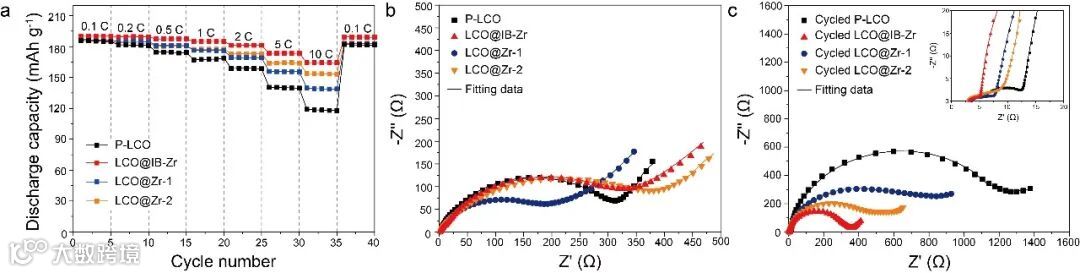 图4. P-LCO, LCO@IB-Zr, LCO@Zr-1和LCO@Zr-2的 (a) 倍率性能和 (b-c) 循环前后的Nyquist图。
