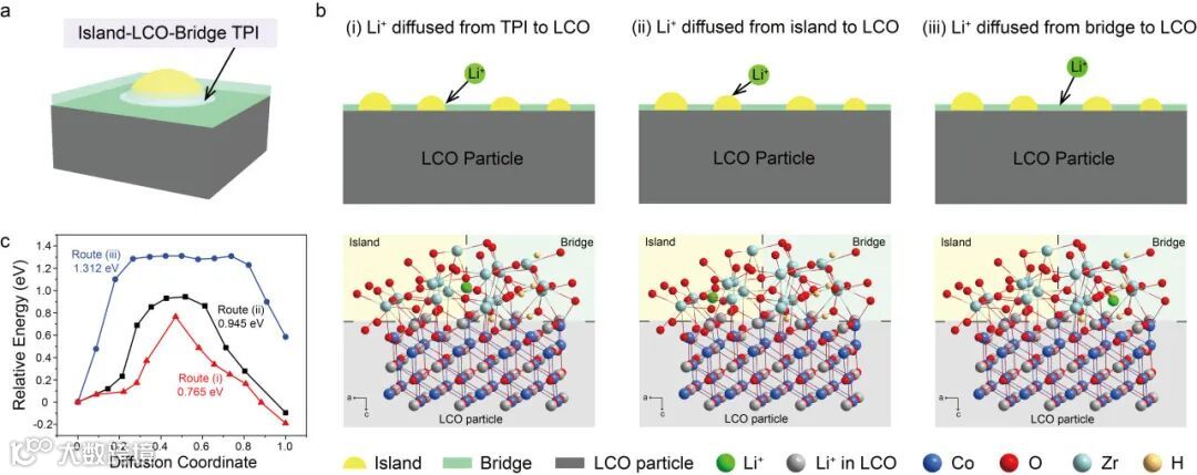 图7. (a)“岛-LCO-桥”三相界面示意图, (b) LCO@IB-Zr中Li+迁移路径示意图, (c) 不同Li+迁移途径的扩散能量曲线。
