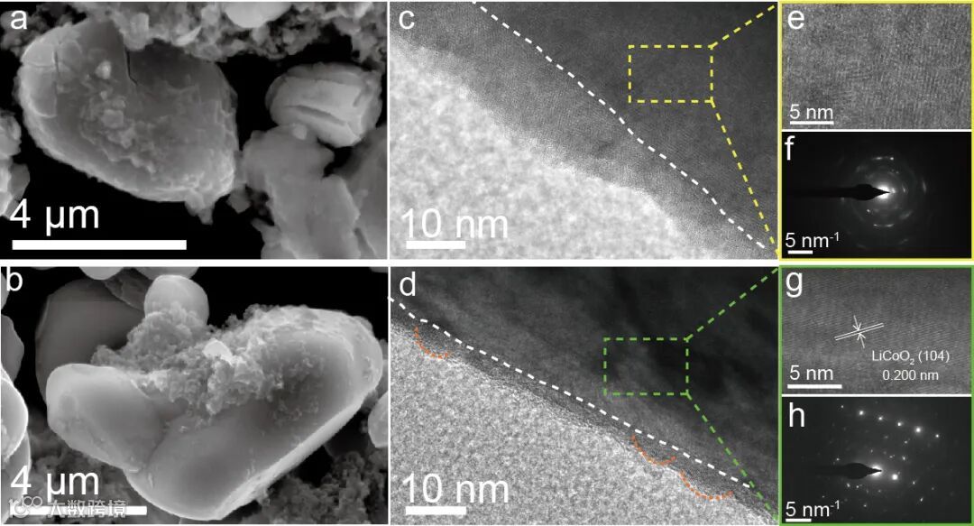 图5. 电极材料循环后的SEM和TEM表征:(a), (c), (e), (f) 为P-LCO; (b), (d), (g), (h) 为LCO@IB-Zr。
