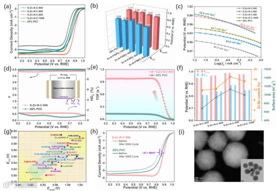 要点三:优化后的球形多孔碳催化剂(S-Zn-N-C-950)富含几何弯曲(25-50°)Zn-N4位点,具有优异的碱性ORR催化活性(Eonset = 1.0 V, E1/2 = 0.89 V)和锌-空气电池性能(峰值功率密度为229.2 mW cm-2),优于大多数报道的Fe-N基ORR催化剂。