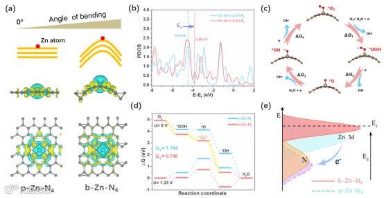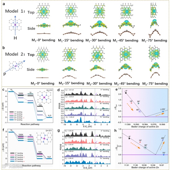 要点一:通过DFT计算,预测几何弯曲可以有效地激活Zn-N4的本征ORR活性,这是由于几何弯曲将更多的电子从Zn转移到配体N上,导致Zn原子的三维轨道向费米能级正移动,从而促进了O2分子的吸附-还原过程。
