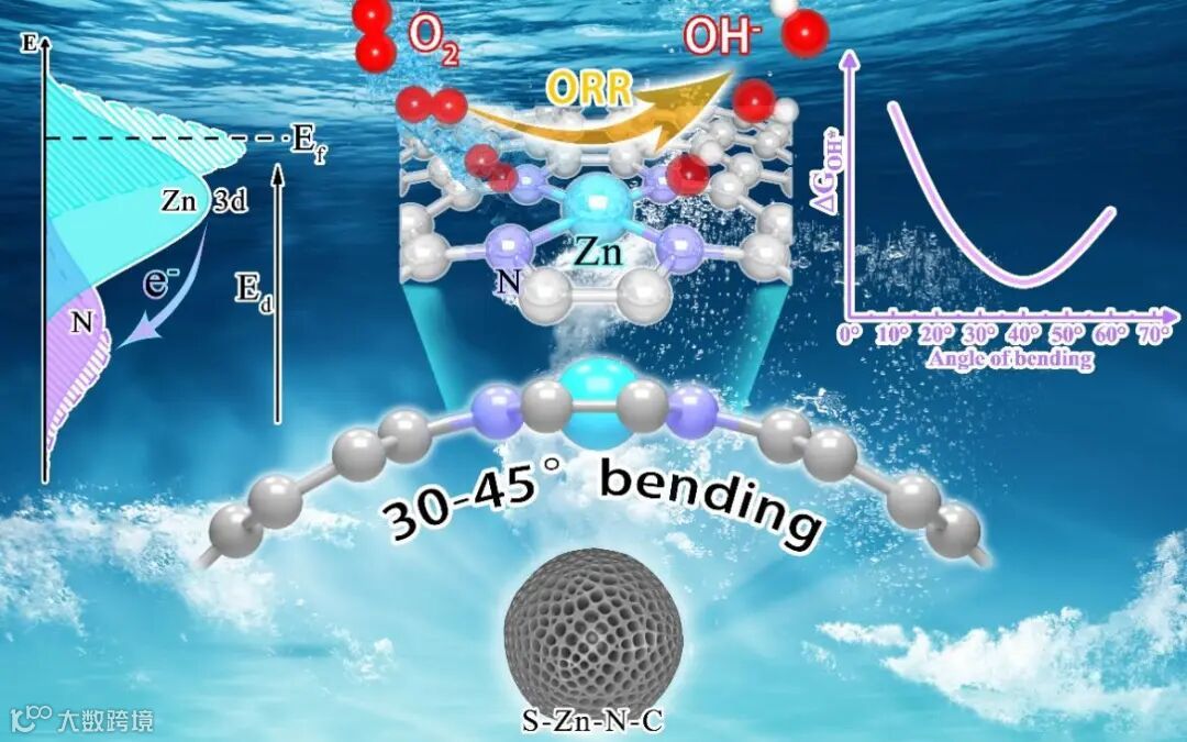近日,福州大学的程年才教授在国际知名期刊《Advanced Functional Materials》上发表了题为“Local Geometric Distortion to Stimulate Oxygen Reduction Activity of Atomically Dispersed Zn-Nx Sites for Zn-Air Batteries”的观点文章。该工作采用计算和实验方法来证明局部几何畸变在增强Zn-Nx基团的ORR活性方面的主导作用。先前的密度泛函理论(DFT)计算预测,局部平面弯曲可以激活Zn原子的d轨道上移,从而优化吸附和解吸到氧中间态的强度,并获得比平面内Zn-N位更有利的ORR路径。随后,他们在实验中提出了一种低温不饱和配位策略来制备表面富集几何弯曲(20-50°)Zn-N-C位的球形多孔碳催化剂进行验证。优化的催化剂(S-Zn-N-C-950)具有高活性的Zn-N-C位点、大的比表面积和丰富的孔隙结构,具有优异的碱性ORR活性(半波电位E1/2 = 0.89 V)和优异的锌-空气电池性能(峰值功率密度为229.2 mW cm-2)。重要的,他们通过DFT计算证明了当几何弯曲角度为30 ~ 45°时,Zn中心对周围N的电荷转移合适,对氧中间态的吸附强度适中,ORR活性最佳。