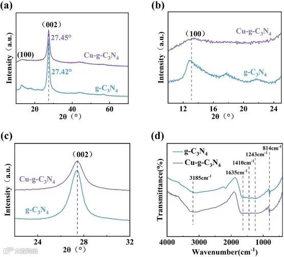 Fig. 2. (a-c) XRD patterns, (d) FTIR of g-C3N4and Cu-g-C3N4.