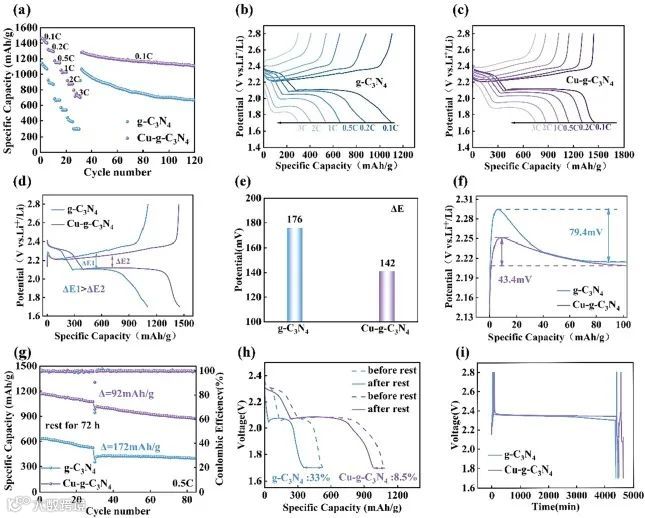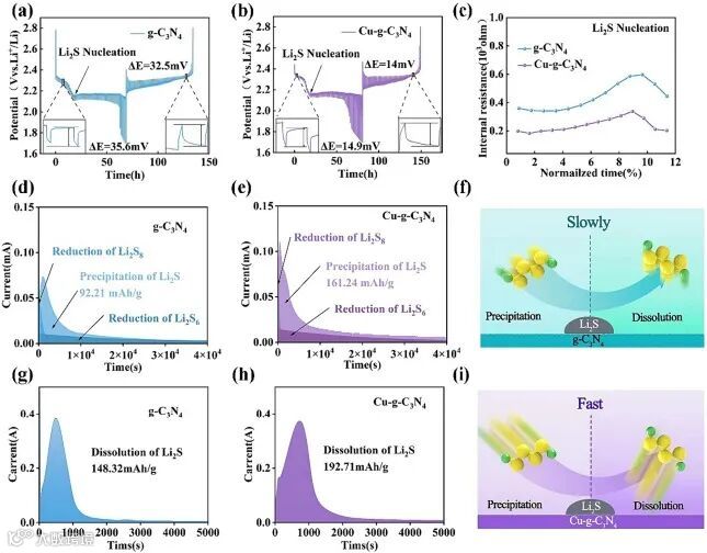 Fig. 6. Galvanostatic intermittent titration (GITT) curves of the cells with (a) g-C3N4and (b) Cu-g-C3N4, (c) Internal resistance to nucleation of the cells relative to the normalized discharge–charge time, Li2Sprecipitation profiles of the cells with (d) g-C3N4and (e) Cu-g-C3N4, Li2Sdissolve profiles of the cells with (g) g-C3N4and (h) Cu-g-C3N4, (f) and (i) Corresponding schematic diagram.
