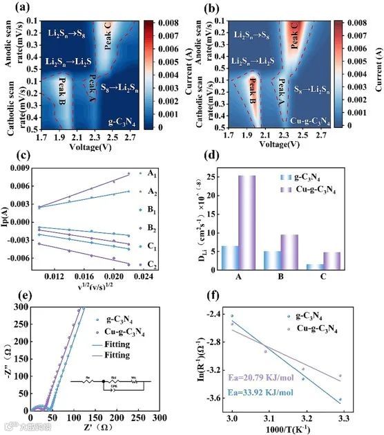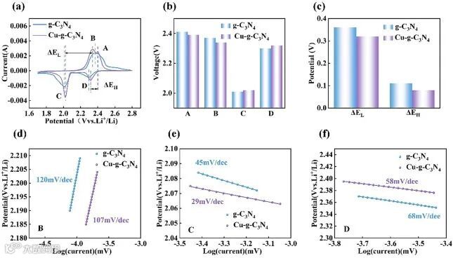 CV曲线中,相比g-C3N4,Cu-g-C3N4具有最大的峰值电流响应,表现出最优异的氧化还原动力学活性。此外,Cu-g-C3N4显示了最大的锂离子扩散系数和最小的极化,说明Cu-g-C3N4可以实现更快、更高效的电子/离子传递。在变温阻抗的测试中,Cu-g-C3N4电池表现出最小的电荷转移电阻;根据Arrhenius公式计算得到Cu-g-C3N4具有最小的反应活化能;Cu-g-C3N4具有最早的出峰电位、最小的极化和最平缓的他菲尔斜率,证明其最优的催化活性,有利于加速多硫化物之间的氧化还原反应。