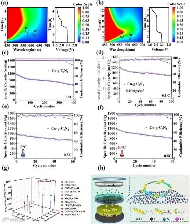 Fig. 8. In-situ UV-vis test with (a) g-C3N4/S, (b) Cu-g-C3N4/S, respectively, (c) 0.5 C, (d) Areal capacity performance of high-sulfur loading Cu-g-C3N4-based cell at 0.1 C, (e) 0℃ and (f) 60 ℃ at 0.5 C, (g) Contrasting electrochemical capabilities of Cu-g-C3N4with those of other developed composites, (h) mechanism diagram.