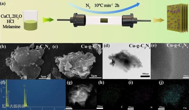 Fig. 1. (a) Schematic diagram of materials synthesis. SEM images of (b) g-C3N4and (c) Cu-g-C3N4, (d) TEM image, (e) HRTEM image, (f) EDS spectra, (g-j) EDS elements mapping of Cu-g-C3N4.