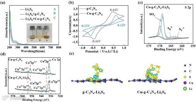 Fig. 5. (a) UV–vis spectra and optical images with adsorbed Li2S6, (b) Symmetric cells, XPS spectra of (c) S 2p in Cu-g-C3N4-Li2S6 and (d) Cu 2p in Cu-g-C3N4and in Cu-g-C3N4-Li2S6, (e) Side view for charge density difference of Li2S6 adsorption on g-C3N4and Cu-g-C3N4. The equivalence plane is set to 0.002 eV/Å3.