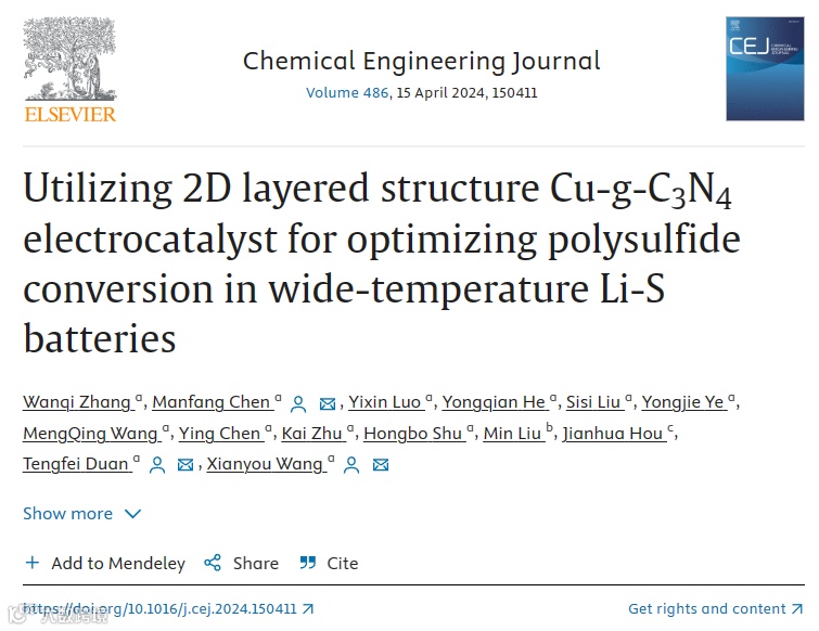 基于此,湘潭大学陈曼芳副教授,段腾飞博士,王先友教授等人在国际化学领域顶级期刊Chemical Engineering Journal上发表题为“Utilizing 2D layered structure Cu-g-C3N4electrocatalyst for optimizing polysulfide conversion in wide-temperature Li-S batteries”的研究论文。